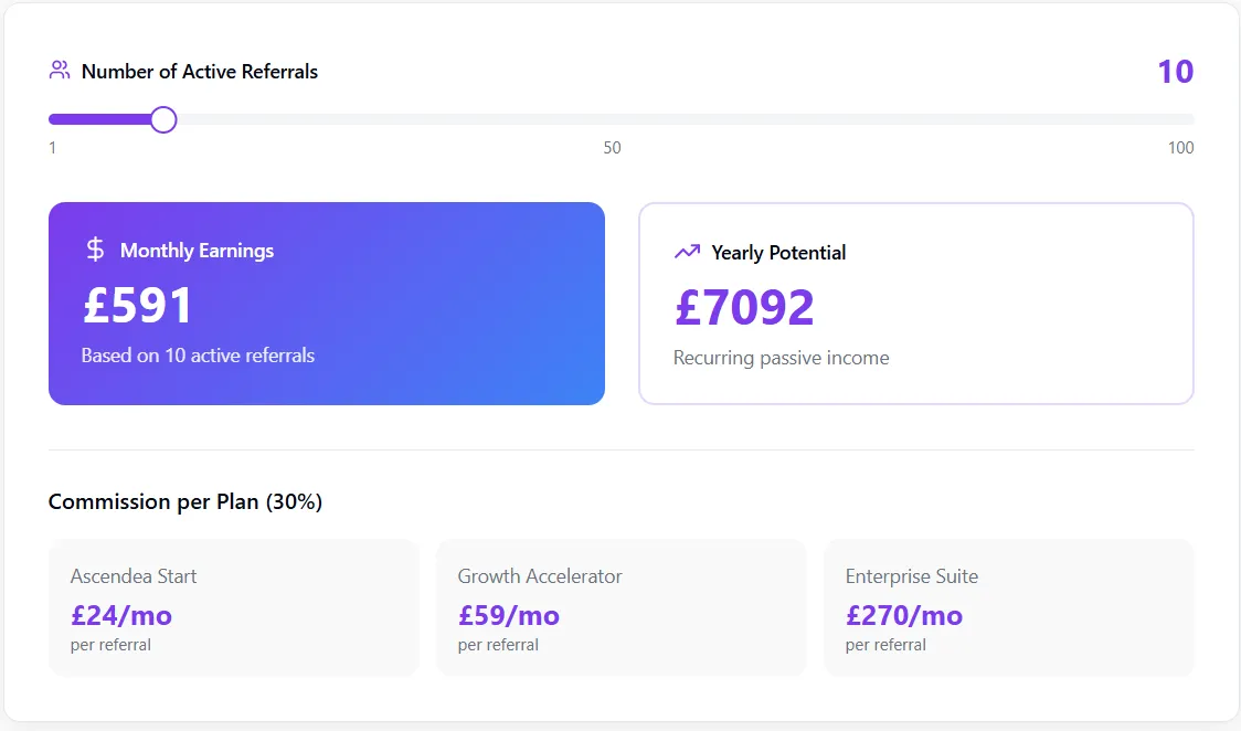 Join the Ascendea AI Affiliate Program and turn your audience into income. Promote world-class AI automation tools that help businesses grow — and earn 30% recurring revenue for every customer you refer.